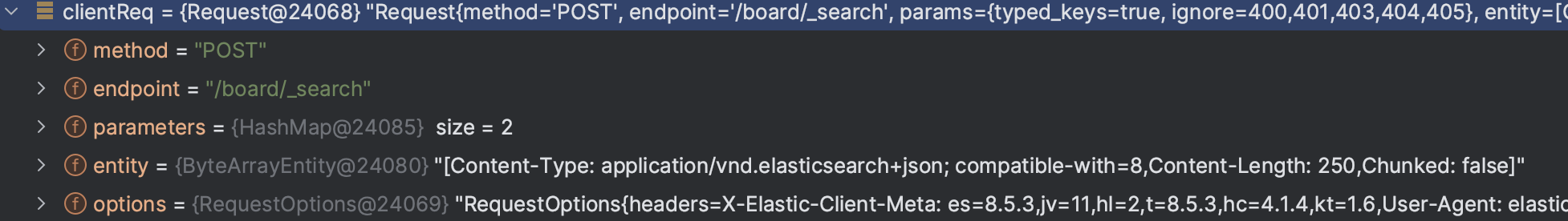 여기서 Request는 SearchRequest: POST /board/_search?typed_keys=true {"query":{"bool":{"filter":[...} 라는 내가 그토록 찾던 API를 만들어 냈다. 이 안에는 HttpMethod, URL, Query를 볼 수 있었다.