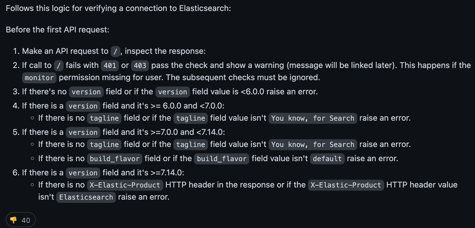 Follows this logic for verifying a connection to Elasticsearch: Before the first API request: Make an API request to /, inspect the response: If call to / fails with 401 or 403 pass the check and ...